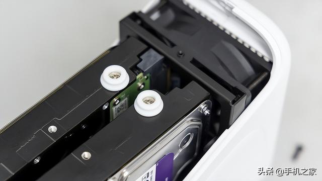 除了静音风扇以外,硬盘也采用了软性连接来降低噪音,硬盘侧边拧上包装内的防震圈,插入槽位后与固定盖板间就有了硅胶圈缓冲。实际体验来看,双盘工作状态下极空间Z2S的噪声也很低,放在卧室中完全不用担心影响睡眠。