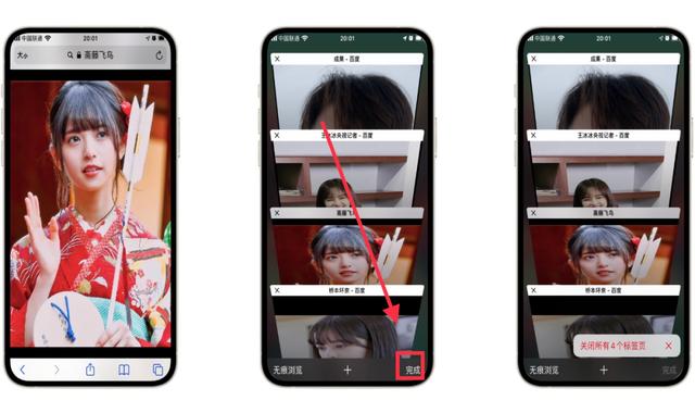 你女朋友突然推门而进,要检查你的手机,此时,你一个一个删除标签页已经来不及了,这时你只需要长按右下角的【完成】