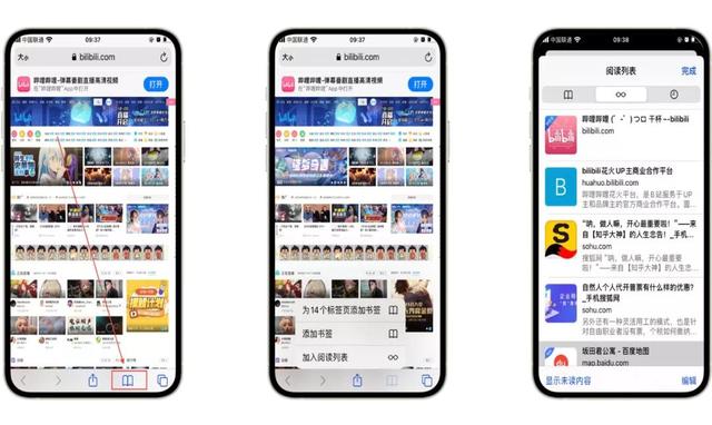 长按浏览器下方的【书籍】按钮,可以给网页添加书签,也可以添加到阅读列表,阅读列表就相当于