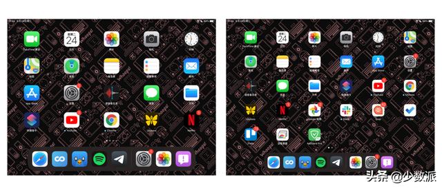 想要提升效率,可以从充分利用主屏幕空间开始。在 iPadOS 上,主屏幕布局现有「更多」和「更大」两种布局方式,前者每页最多可以显示 30 个 App 图标,后者则是之前版本的 20 个大图标。除了在初始设置中进行选择,你也可以在「显示与亮度」中自行切换。