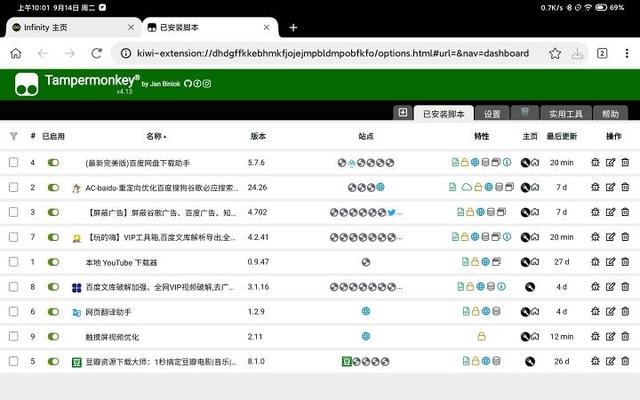 1.infinity标签页。严格意义上说,这不是插件(电脑上需要插件)。专门适配了移动端,完美接管你的新标签页和书签,功能强大,可自定义首页网站和书签,并且登录后可多平台同步,壁纸也很有品味,非常好用!另外,记得把你的首页设置成infinity标签页。