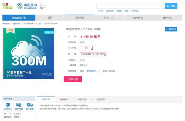 移动网上营业厅宽带只有5G融合套餐,没有单宽带。最便宜的300兆宽带是5G智享套餐(个人版)128元/月(30G流量+500分钟),合计1536元/年,又打移动10086客服问了一下,如果你是移动的老客户,会让你办理最低消费套餐+IPTV每月10元,可能比这个价格低。