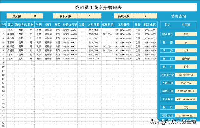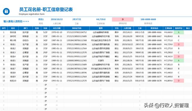 员工花名册,立体化员工信息展示,包括员工岗位信息、历年考核结果、调薪记录、奖惩记录、教育经历、工作经历一键查询