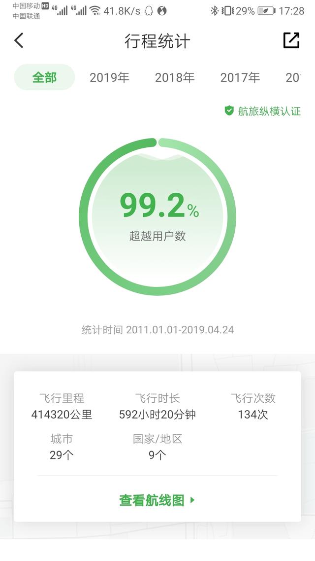 航线图和行程统计也变了脸,前者界面更加酷炫(中国到美洲的航线终于正常了),后者更加详尽,比如可以按照不同年份、航司、国家和城市、机场等查看相关数据。