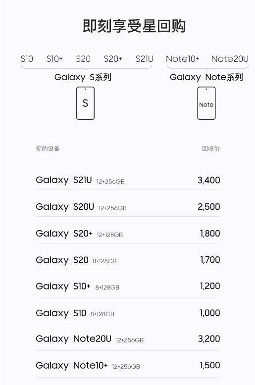 具体机型回购价方面,三星 S21 Ultra 12+256GB 版本回收价格为 3400 元,S20 Ultra 12+256GB 版回收价为 2500 元,三星 Note 10+ 12+256GB 版的回收价格为 1500 元,而 8+128GB 版 S10+ 的回收价为 1200 元。