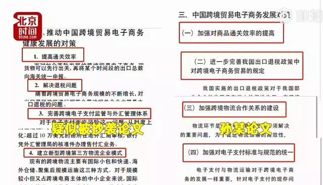 据@时间视频 报道,孙某在《工业经济论坛》2017年第6期发表论文,内容为研究中国跨境贸易电子商务的现状和对策。在中国知网中,以该主题进行搜索,共有9条结果,最早的一篇论文为2014年3月发表。网友对比两篇论文,主体部分存在高度相似部分。