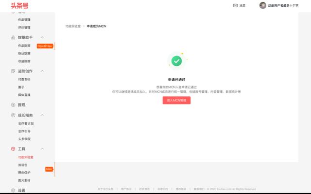 方式二:PC端点击https://mp.toutiao.com/,登陆头条号后台,点击工具-功能实验室-MCN,进入MCN申请入驻页面进行申请。
