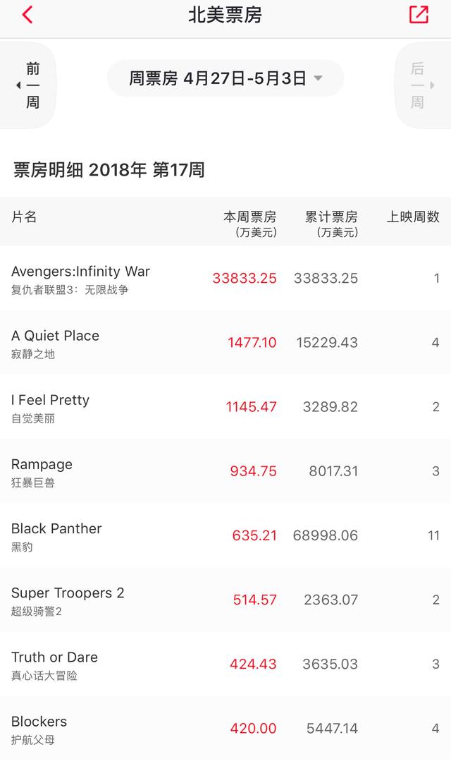 北美票房第17周(4.27-5.3),大盘报收40288万美元,比上一周增长了180.8%,是2018年目前为止,北美大盘最高的一周。其他电影的票房全部下降,《复仇者联盟3:无限战争》一家独大,承包了33833万美元的票房,《黑豹》将手中的摇钱树成功交接给《复联3》。