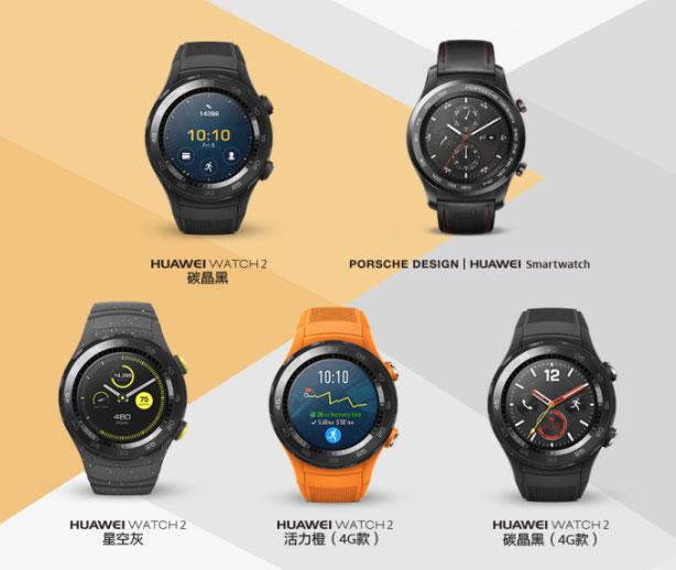 HUAWEI WATCH 2共分为两款不同的外观设计,三种颜色和两个版本,除了保时捷设计款的HUAWEI WATCH 2 Classic使用的皮质表带外,HUAWEI WATCH 2的所有表带均选用塑胶表带,塑胶表带共有活力橙、星空灰和碳晶黑3种颜色,并有4G数据信号版和非4G版两种型号。