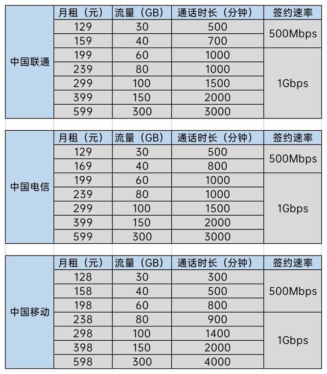 从上图不难看出,三大运营商5G套餐资费大同小异,签约速率方面分为500Mbps和1Gbps两档。联通和电信需要199元及以上套餐才能享受1Gbps的速率,而移动需要花费每月238元及以上的费用。