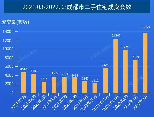 据大唐楼市数据监测,2022年3月成都市二手住宅总成交13858套,环比增加89.3%,同比增加205.1%,4月成都市二手住宅总成交12443套,环比减少10.2%,同比增加197%,呈现出连涨态势。