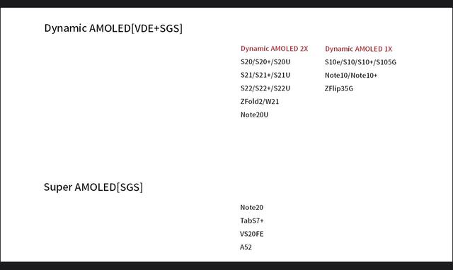 从S20系列开始,三星的旗舰系列搭载的都是Dynamic AMOLED 2X动态屏,1代的Dynamic AMOLED动态屏是从S10系列开始引入的,2代也就是它的升级版。Dynamic AMOLED动态屏主要是有两个认证:VDE以及SGS,被称之为最强屏幕。