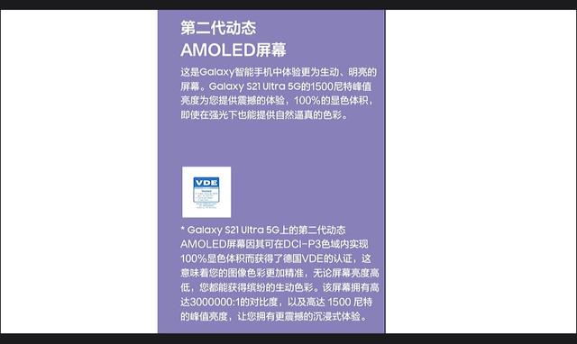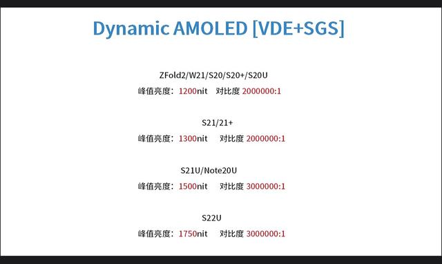 在三星手机的屏幕中,只要有VDE认证,它就可以保证手机100%全覆盖DCI-P3色域,屏幕的最高亮度也会达到1200-1500尼特,动态对比度可以达到200万:1。