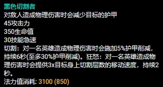 我们在分析黑切的时候不得不提一下黑切这件装备能给卡莎带来的优点。黑切这件装备可以提供不俗的穿甲和生命值,出1件黑切就可以让卡莎变得又肉又有输出,这件装备还有一个特点就是,卡莎的Q技能的伤害属于单独结算的(划重点很关键!)!卡莎的Q结合黑切的“切割”的被动可以实现1秒直接叠满,所以这才是战士黑切卡莎玩法在近期崛起的根本原因。