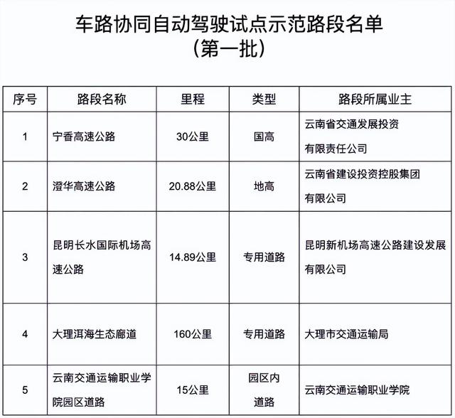 3.云南将开通5条路段试点自动驾驶5月24日,云南省工业和信息化厅官网发布的《关于“十四五”推进云南省车路协同自动驾驶试点示范建设的指导意见》明确,将在宁香高速公路、澄华高速公路、昆明长水国际机场高速公路、大理洱海生态廊道、云南交通运输职业学院园区道路5条路段试点车路协同自动驾驶。