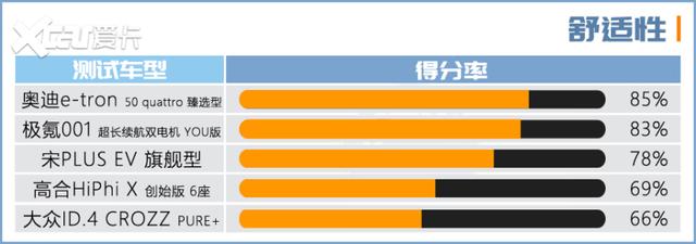 舒适性方面,奥迪e-tron和极氪001具有较大优势,得分率超过了80%。宋PLUS EV表现远超预期,凭借柔韧的底盘和良好的隔音,来到了榜单第三名。高合HiPhi X和大众ID.4 CROZZ分列第四名和第五名,但得分率不足70%,比起TOP3存在明显差距。