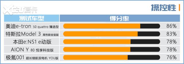 操控方面,TOP5车型为奥迪e-tron、特斯拉Model 3、本田e:NS1、广汽埃安AION Y和极氪001。奥迪e-tron在操控性和舒适性之间取得了高水准的平衡,是近期测试的12款电动车中底盘最完善的车型。整体来看,国际大厂依然具备优势,但头部中国品牌正迎头赶上。