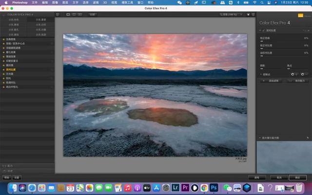 比如这里,有的是决定星芒的亮度和色温,有的是决定星芒光线的长度和中心点光源大小,有的是决定星芒与山体的遮挡关系。拖动滑块的时候,就能明显看到照片的改变。满意后点击“应用”,就能回到Photoshop的界面。