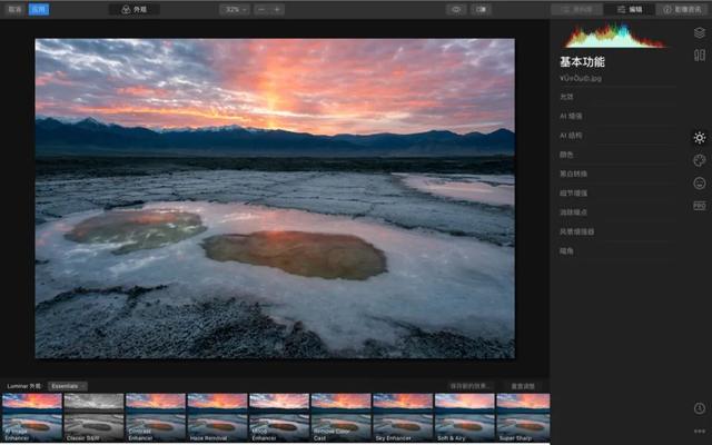 其工作窗口的布局与ACR界面有些类似,中间是照片的效果预览,右上方是直方图便于观察,右边则是诸多调整操作的工具栏。其中很多功能与Photoshop或者其他插件重复,那么我们这里首要关注的就是其特色的一些用法。