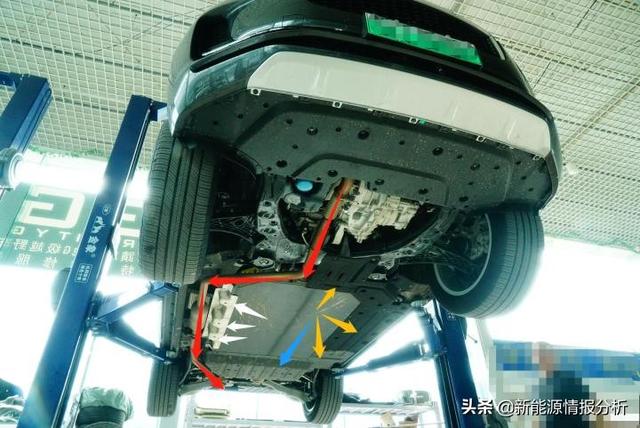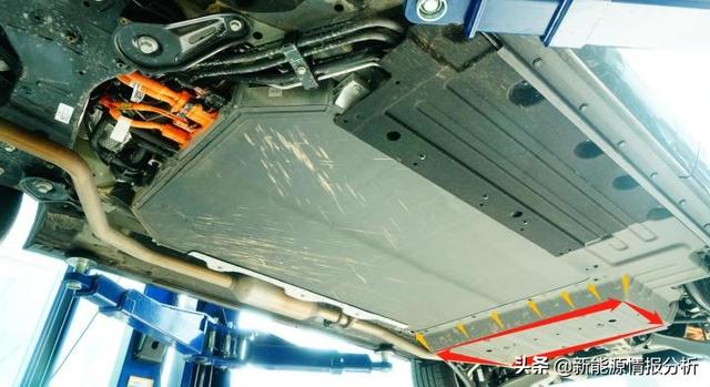 为了隔绝“裸露”在外的排气管(前端消音器)部分发出的热量,铺设完整的衬垫围绕动力电池前端和副驾驶员一侧。 红色箭头:前副车架下护板与动力电池总成前端“啮合” 蓝色箭头:隔热衬垫