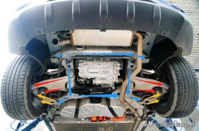 拆除后副车架下护板后可见排气管后部消音器,而全框型后副车架(蓝色箭头)、上控臂(白色箭头)、下A型摆臂(红色箭头)、后摆臂(黄色箭头)以及后转向节全部选用铝材质。赛力斯华为智选SF5采用了大量的铝合金材质进行整车轻量化处理,保证整车刚性强度的同时,进一步减轻簧下质量,提升驾控感受和降低行驶电耗。 需要注意的是(2)铸造的后副车架轻量化效果更加优化同时,通过4组“悬置”机构为后置HUAWEI DriveONE三合一电驱动系统提供更好支撑作用。