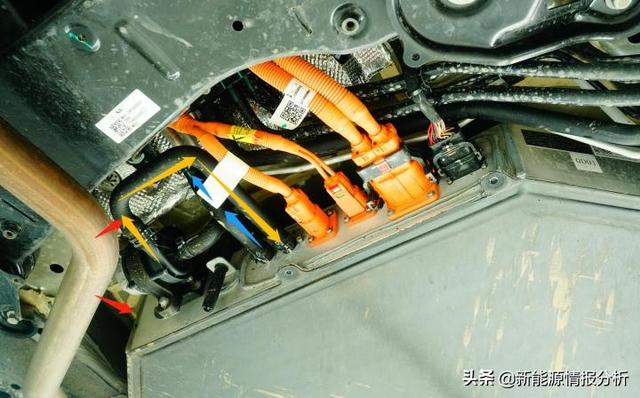 上图为2021款理想ONE动力电池前部细节特写。 黄色箭头:经过制冷或预热的冷却液,通过电子水泵至动力电池内部的管路(进口) 蓝色箭头:冷却液从动力电池总成循环出来的管路(出口) 红色箭头:排气管和循环管路的距离非常接近 理想ONE前端的排气管与动力电池温控循环管路非常接近,且没有设定隔热衬垫进行保护。至于那台1.2T三缸机在高转速输出动力至发电机的过程中,经排气管散发热量,是否会影响动力电池了循环管路和电子水泵耐用性,不得而知。