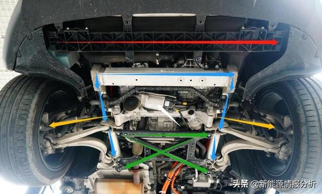 拆除前副车架下护板后,可见十分规整的全铝材质前悬架、转向机以及为了钢材质的副车架加强组件等风系统技术状态特写。 红色箭头:工程塑料材质的前散热器框架(承载散热器、电子扇以及调速控制模组) 蓝色箭头:全框型铝材质前副车架 绿色箭头:钢材质前副车架“X”型加强组件 黄色箭头:电子转向机外拉杆(至转向节)