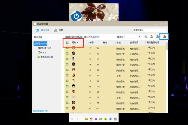 第三步:勾选所有好友项(图中红框),然后点击删除好友按钮(图中蓝框)删除所有好友。