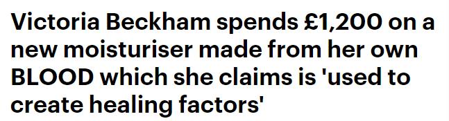 ▲图片截取自Daily Mail;维多利亚·贝克汉姆花1200英镑买了用她的血制成的面霜;她称这能够让护肤品发挥更好的修复效果