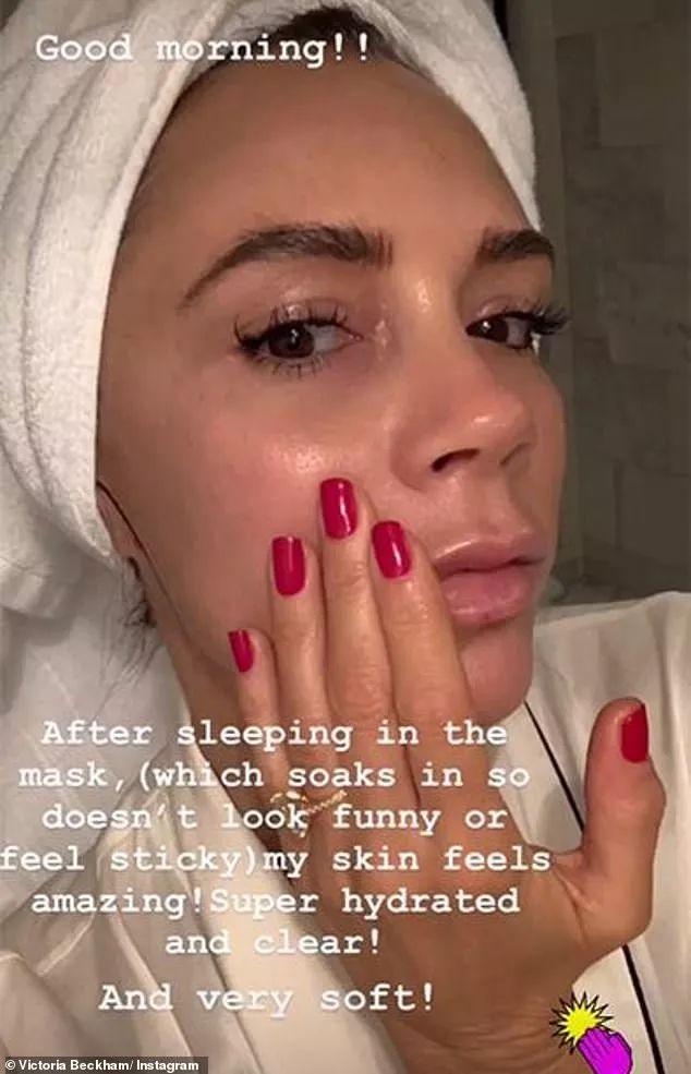 While she already has glowing skin, which was seen in her selfie, Victoria continued: 'After sleeping in the mask, my skin feels amazing!