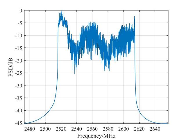 针对2515MHz-2615MHz信号,并未设置中心频率为2565MHz,而是设为了2580MHz,因为在观察频谱时发现在这个信号旁边还部署了两个20MHz带宽的LTE信号,所采用的采样率为184.32MHz,整个采集信号的频谱图如下所示: