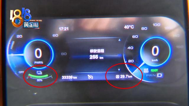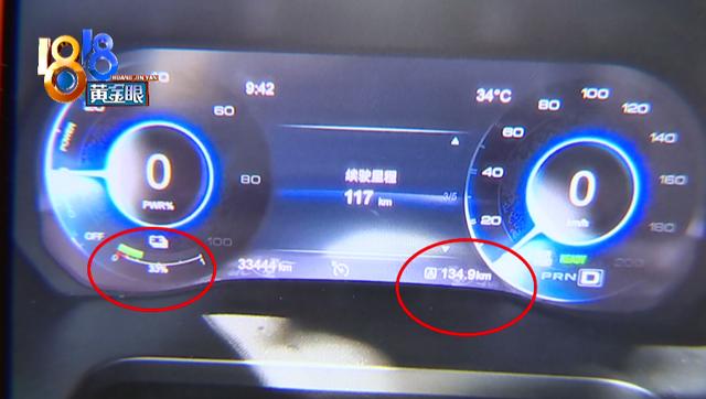 郭先生的照片显示,车子电量剩余百分之八十时,行驶了二十九点七公里,电量剩余百分之三十三时,行驶了一百三十四点九公里,相当于百分之五十的电只能行驶一百公里左右。