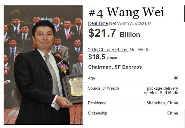 目前顺丰控股的总市值已经高达2310亿元,超越万科、美的,成为深交所市值第一名。以王卫的持股比例估算,其个人身家已经接近1500亿元,这足以杀入《2016胡润百富榜》前五名,位列王健林家族(2150亿元)、马云(2050亿元)、马化腾(1650亿元)之后,成为第四大千亿富豪。