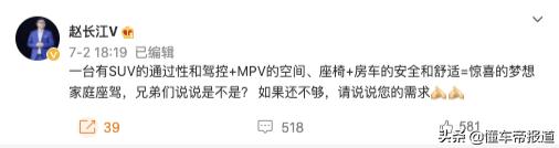 到了7月2日,赵长江再次发文,预示新车将具有SUV的通过性、MPV的空间、房车的舒适等特点。