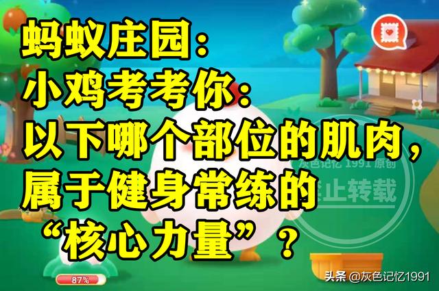 蚂蚁庄园:小鸡考考你:以下哪个部位的肌肉,属于健身常练的“核心力量”?A、臀部 B、小臂。