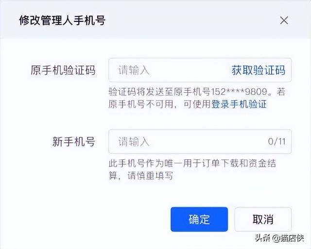 原手机号无法获取验证码怎么修改?商家进入放店铺后台设置,点击【管理人手机号】修改按钮后,点击蓝色文字部分切换至登录手机号验证界面,使用登录手机号进行验证后,输入新手机号,点击确定,即可完成变更。