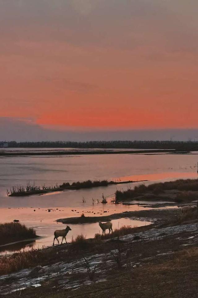 黄昏降临,落日将镜子似的水面与漫天的云霞涂抹成一片绯红色,芦苇摇曳出绮丽的金红色光泽。四野寂静,来往的零星货车似乎刹那间都消失了,只有水光粼粼、飞鸟回巢,随着夕阳西沉,麋鹿停驻水边的身影在斜晖中逐渐变成纤长,并染上了落日的光芒。