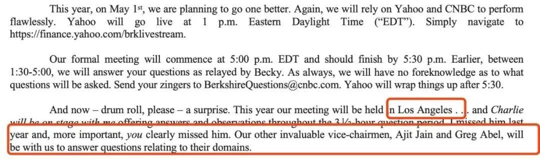 巴菲特在致股东信中预告,今年的股东大会将于5月1日在洛杉矶举行,而不是在奥马哈。出席人员除了巴菲特和芒格外,伯克希尔·哈撒韦公司的副董事长格雷格·阿贝尔和阿吉特·贾因也将回答投资者问题。