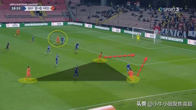 进攻风格的差异德波尔执教的荷兰队一旦将进攻向前推进,他们更喜欢在侧翼制造不断移动的进攻区域三角形。当边锋回撤到肋部后,边后卫的位置会提到与边锋平行的位置,这样边锋、边后卫和一名中场球员就组成了局部的区域三角形,这会让荷兰在边路的进攻能够更容易突破对方的防守。在欧国联对阵波黑和意大利的两场比赛中,荷兰队109次进攻中有74次来自侧翼,边路的进攻占比几乎达到了68%。