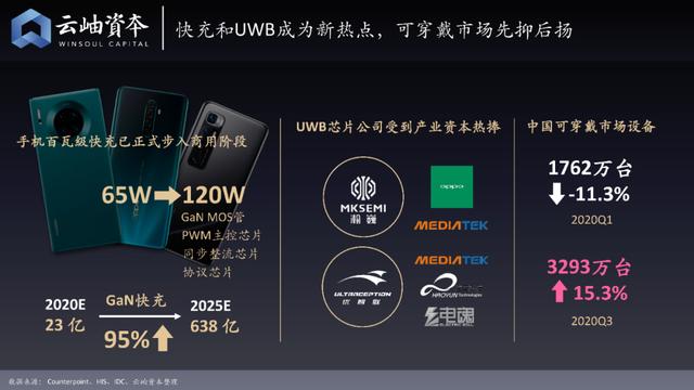 消费电子的下游需求方面,快充和UWB成为新的热点,可穿戴市场的发展先抑后扬。