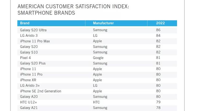 一份新的美国客户满意度指数(ACSI)报告显示,在美国,2022年至今,消费者心目中的最佳智能手机是三星Galaxy S20 Ultra。这与去年的报告相似,该报告显示Galaxy Note 10 Plus、S20 Plus和Galaxy S10 Plus之间并列第一。