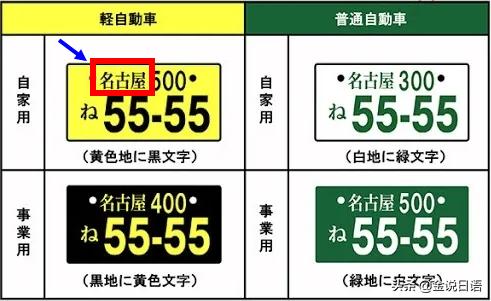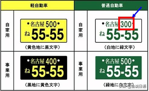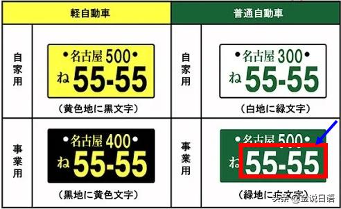 日本车牌号颜色比国内多,共分为:白、绿、黑、黄四种颜色。白底绿字表示普通私家车;绿底白字表示普通商业用车;黄底黑字表示自家用轻型汽车;黑底黄字表示商业用轻型汽车。