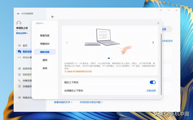 不仅有华为手机上经典的指关节截图手势,还可以实现单指在压力触控板边缘上下滑动调节音量、屏幕亮度等功能。在没有鼠标的情况下,也能很便捷地调整系统设置,大大提高了我们的使用体验。