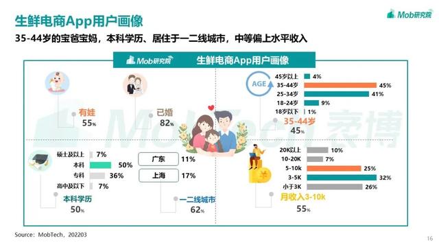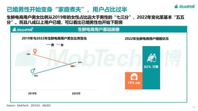 •生鲜电商用户男女比例从2019年的“女七男三”,2022年变化至基本“五五分”。而且八成以上用户已婚