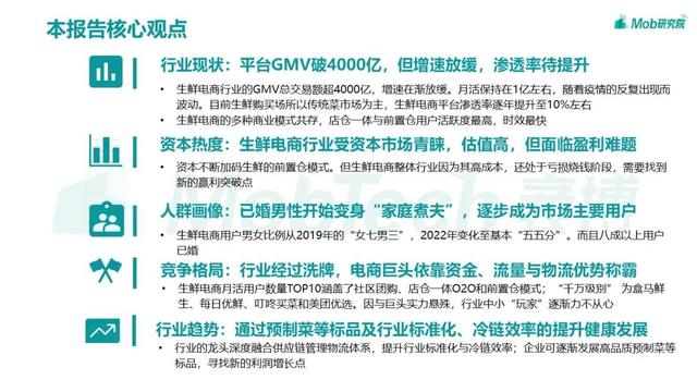 •生鲜电商行业的GMV总交易额超4000亿,增速在渐放缓。月活保持在1亿左右,随着疫情的反复出现而波动。目前生鲜购买场所以传统菜市场为主,生鲜电商平台渗透率逐年提升至10%左右