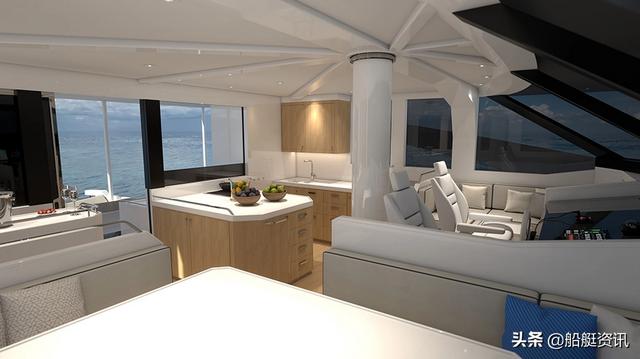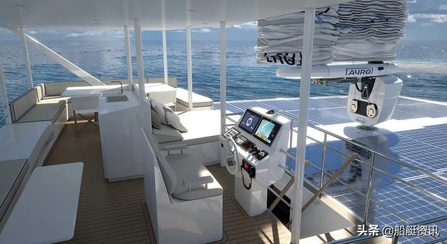 与此同时,船上提供了一系列的豪华设施。室内布局包括三个独立的用餐区,一间专业厨房,沙龙和两间湿厨房。客舱里还可以容纳多达12位客人。太阳能船顶实际上变成了一个巨大的上层甲板,可以一览无余的景色,而366平方英尺的飞桥可以与80英尺长的动力艇相媲美。最重要的是,ZEN 50不需要传统的化石燃料。