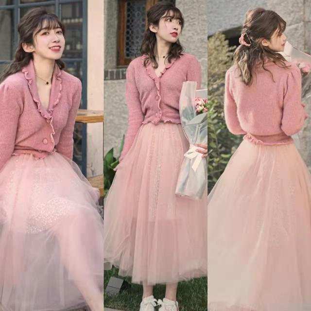 粉色针织衫+淡粉色纱裙简约基础款的粉色针织衫,经典的V领设计,上身成熟优雅又大气。极度柔和梦幻的颜色,穿起来也是很显温柔气质感。采用同色系搭配方式,搭配一条长长的粉色纱裙。