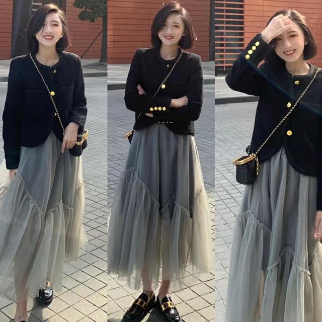 黑色短外套+灰色纱裙纱裙的材质轻盈飘逸,梦幻又灵动,很有少女气质感。与一些气质干练利落的服饰搭配在一起,也是可以打破正式感,看起来更随性松弛。