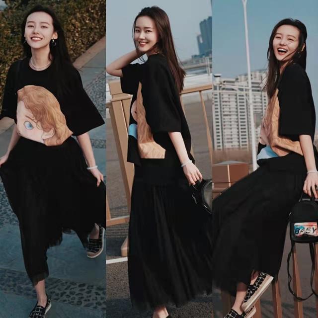 黑色印花T恤+黑色纱裙穿一件宽松的黑色的印花T恤衫,上面的印花图案设计十分简约,是一个油画质感的小女孩头像,看起来就有一点点“暗黑童话”的味道。