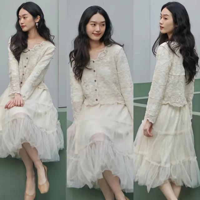 不规则的裙摆设计,错落有致,上身也很显层次时尚感。外搭一件蓝色的蕾丝外套,穿搭更显精致气质。一身穿搭仙气十足,很是好看。